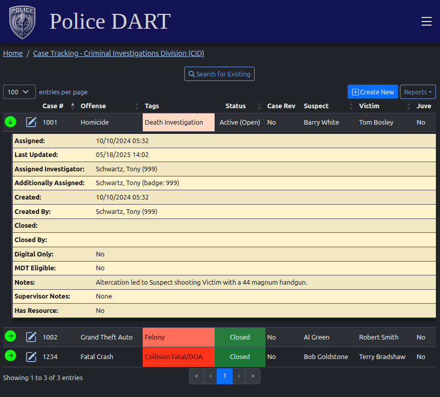 - Criminal Investigations Division Cases managed in separate module from Patrol Cases.