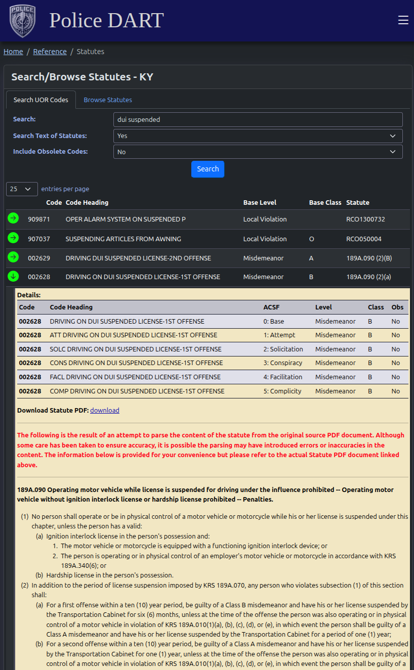 - Legal Statutes – Browse or search legal texts and offense codes.